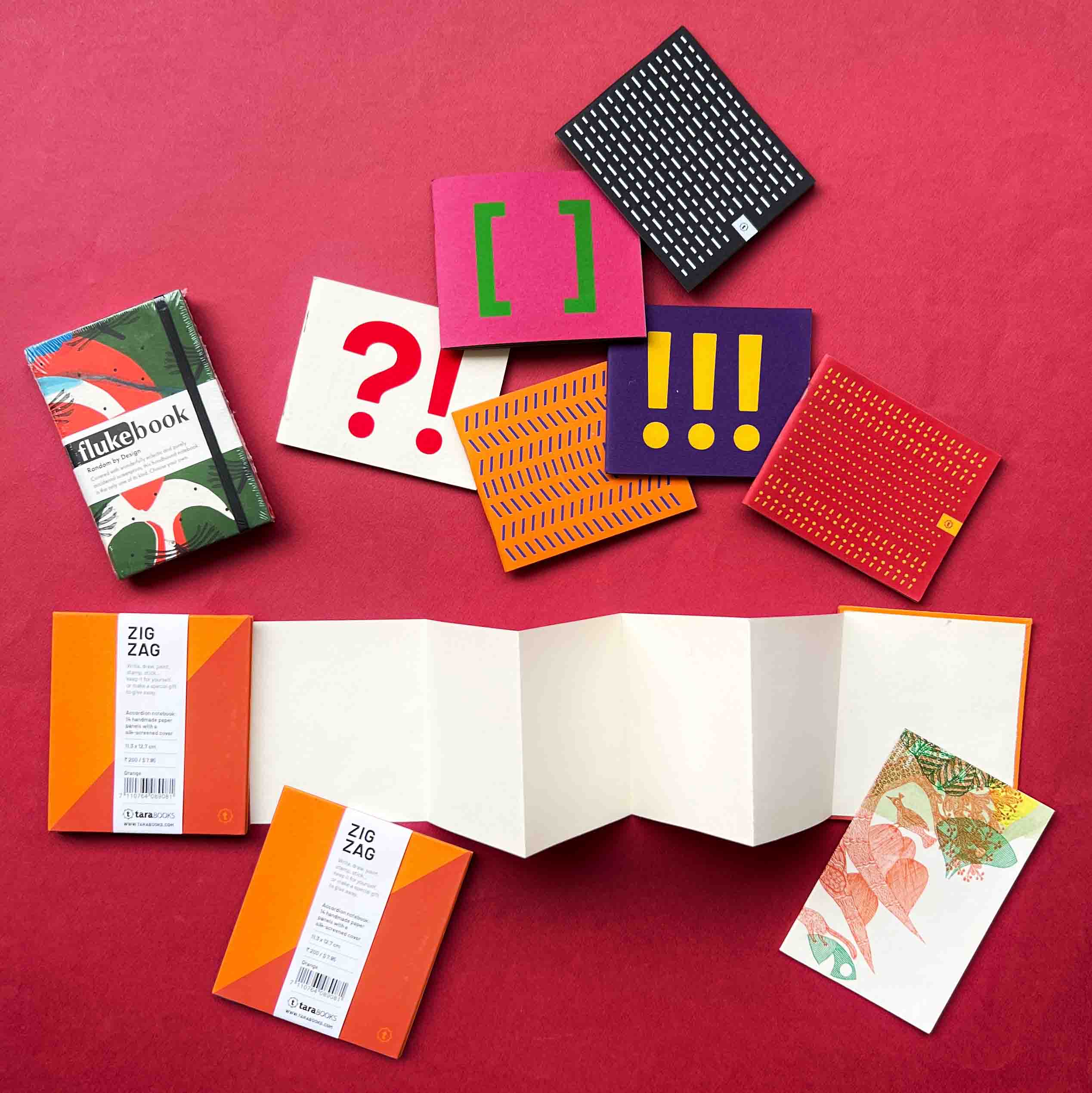 Accordion notebooks with 14 handmade paper panels and a screen-printed cover.