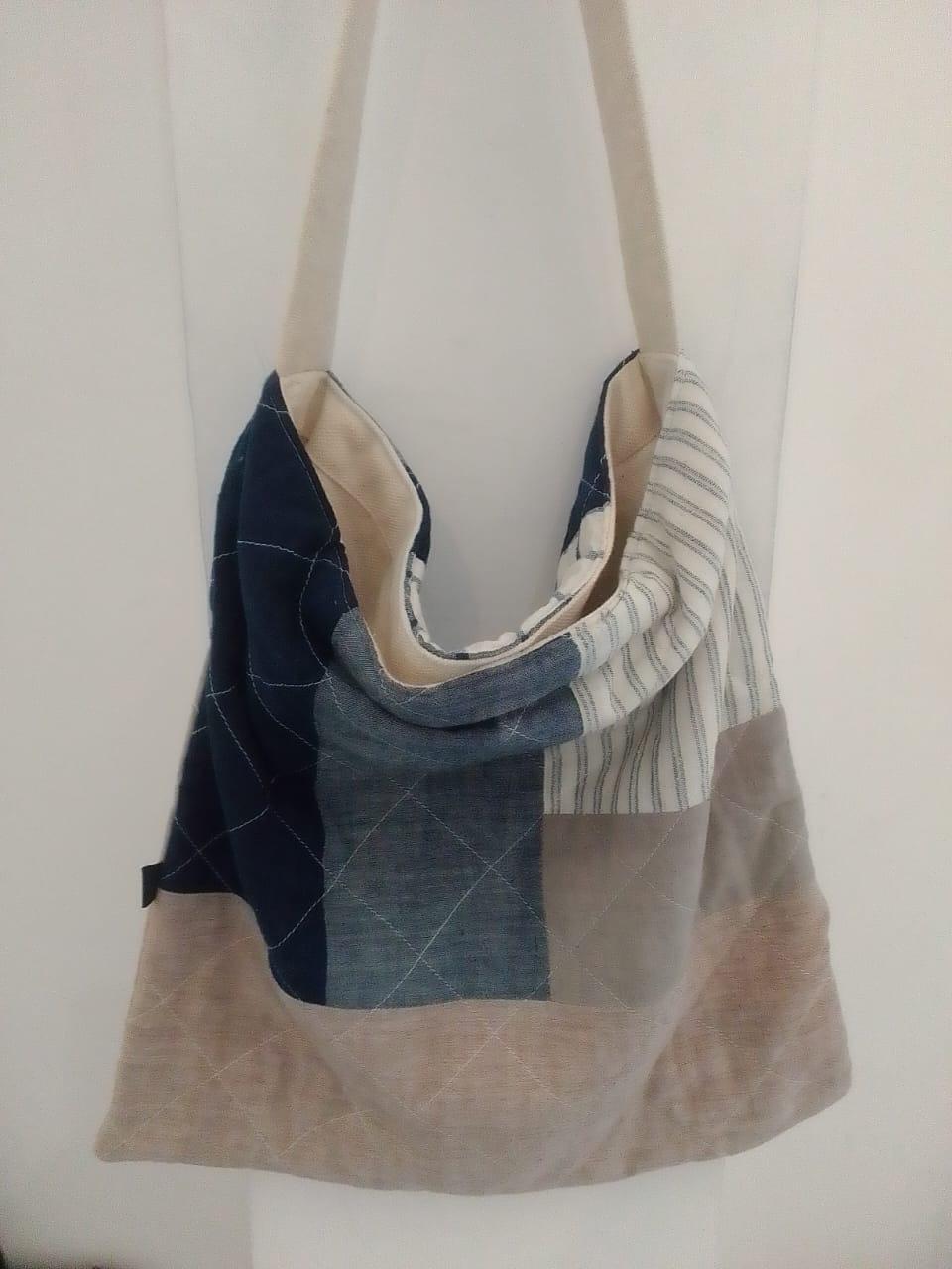 Patchwork bag made using off-cut pieces of various naturally dyed and handwoven fabric