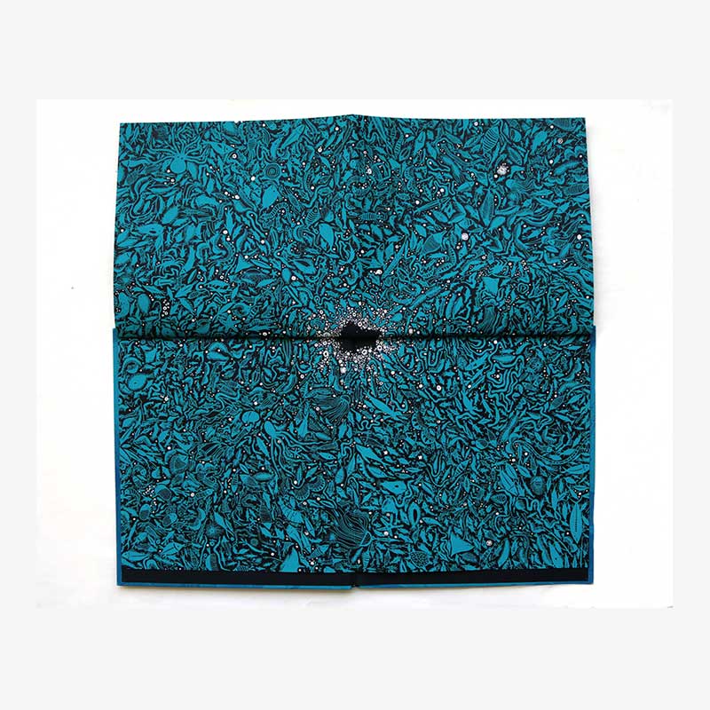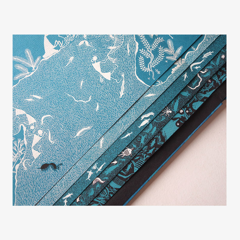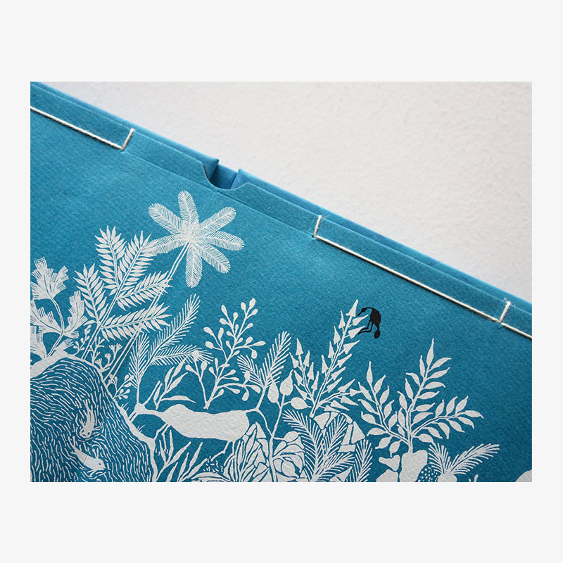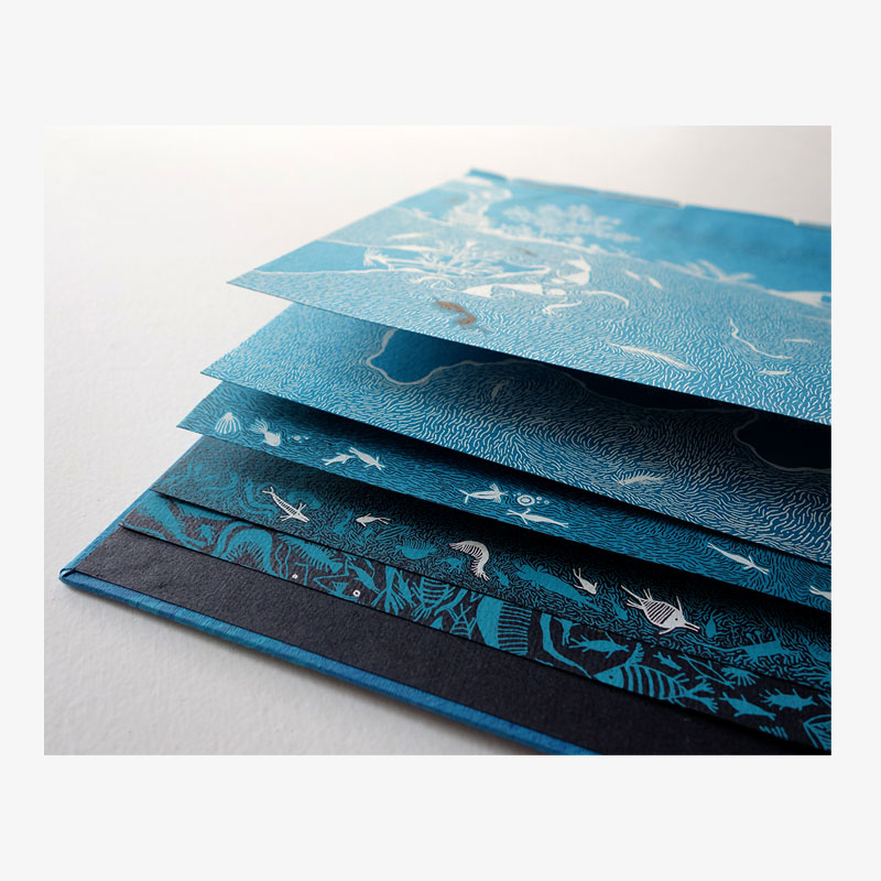 This hand-bound book has been silkscreen-printed by hand on recycled cotton paper. The marbling pattern on each cover is unique, and made by capturing colour on the surface of water at a moment in time.